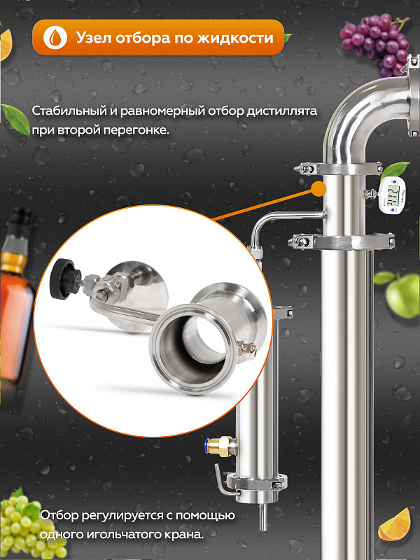 Электронный термометр установлен на крышке бака и в узле отбора, что позволяет контролировать температуру восходящих спиртовых паров.